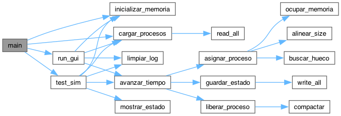 Hace referencia a cargar_procesos(), inicializar_memoria(), MAX_PROCESOS, run_gui() y test_sim().